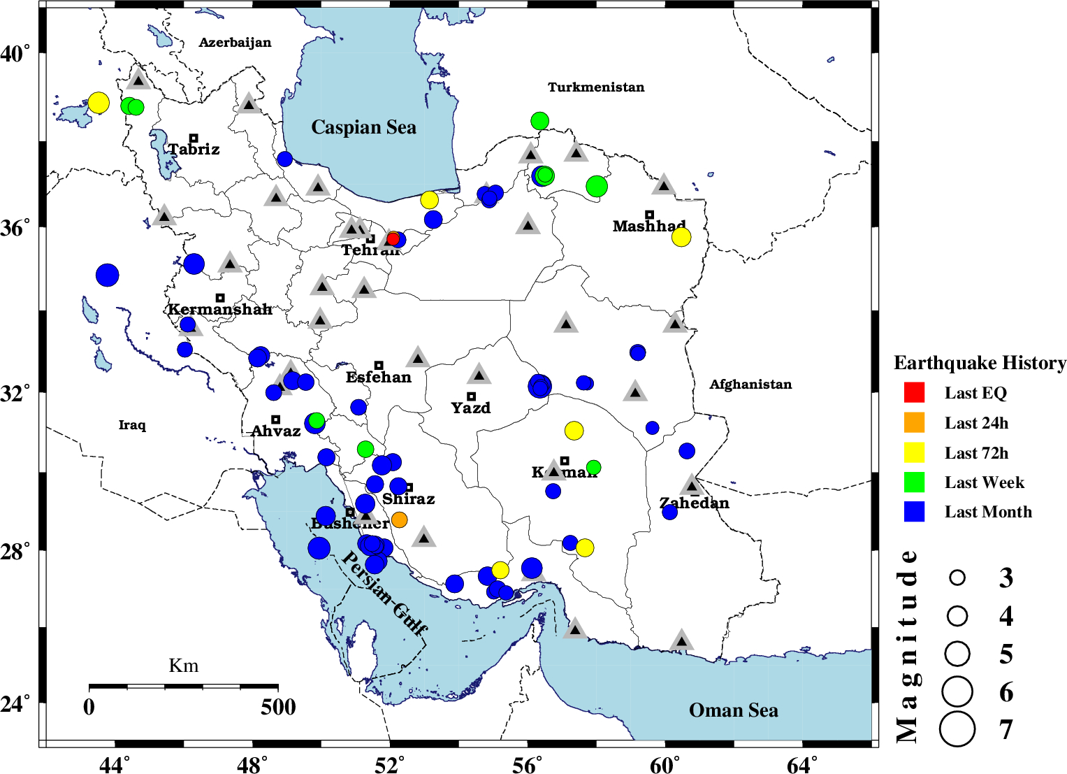 | 2025/11/16 | 02:21:35.2 | 05:51:35.2 | 29.644 | 52.238 | 12 | ML3.5 | Fars Province, 29 km -West of Shiraz | ||