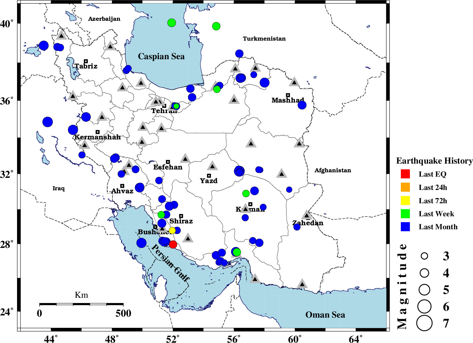 | 2025/12/03 | 00:20:25.4 | 03:50:25.4 | 28.178 | 51.477 | 12 | ML3.3 | Bushehr Province, 54 km South-East of Khormog | ||