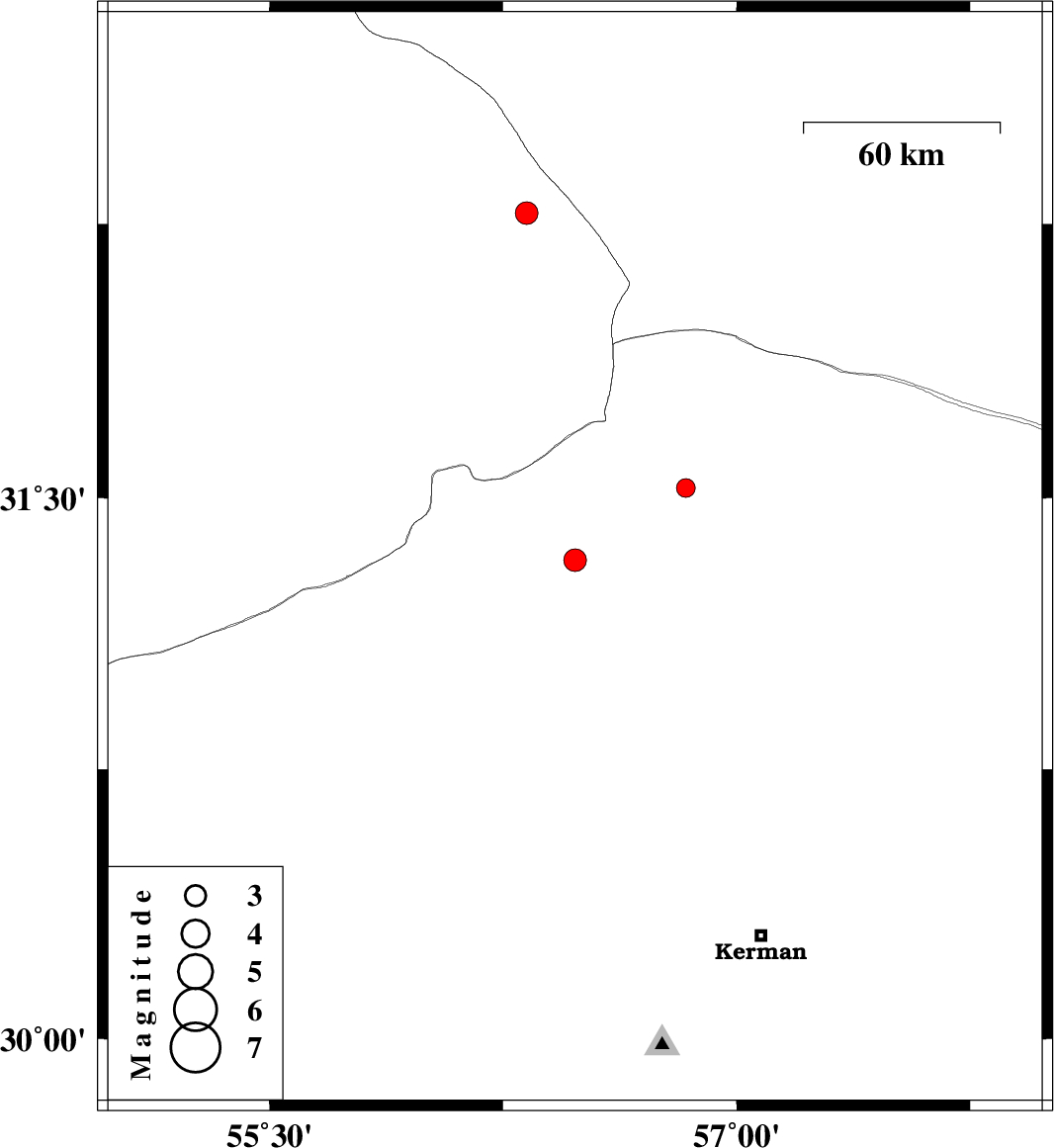 | 2015/07/12 | 14:39:46.8 | 19:09:46.8 | 31.526 | 56.836 | 14 | ML:2.7 | Kerman Province, 29 km North of Ravar |