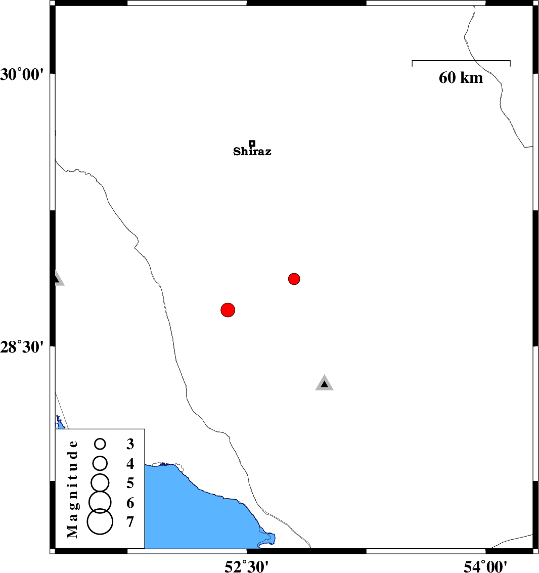 | 2015/06/26 | 05:16:04.2 | 09:46:04.2 | 28.7 | 52.38 | 6 | ML:3.9 | Fars Province, 25 km South-West of Firuz Abad |