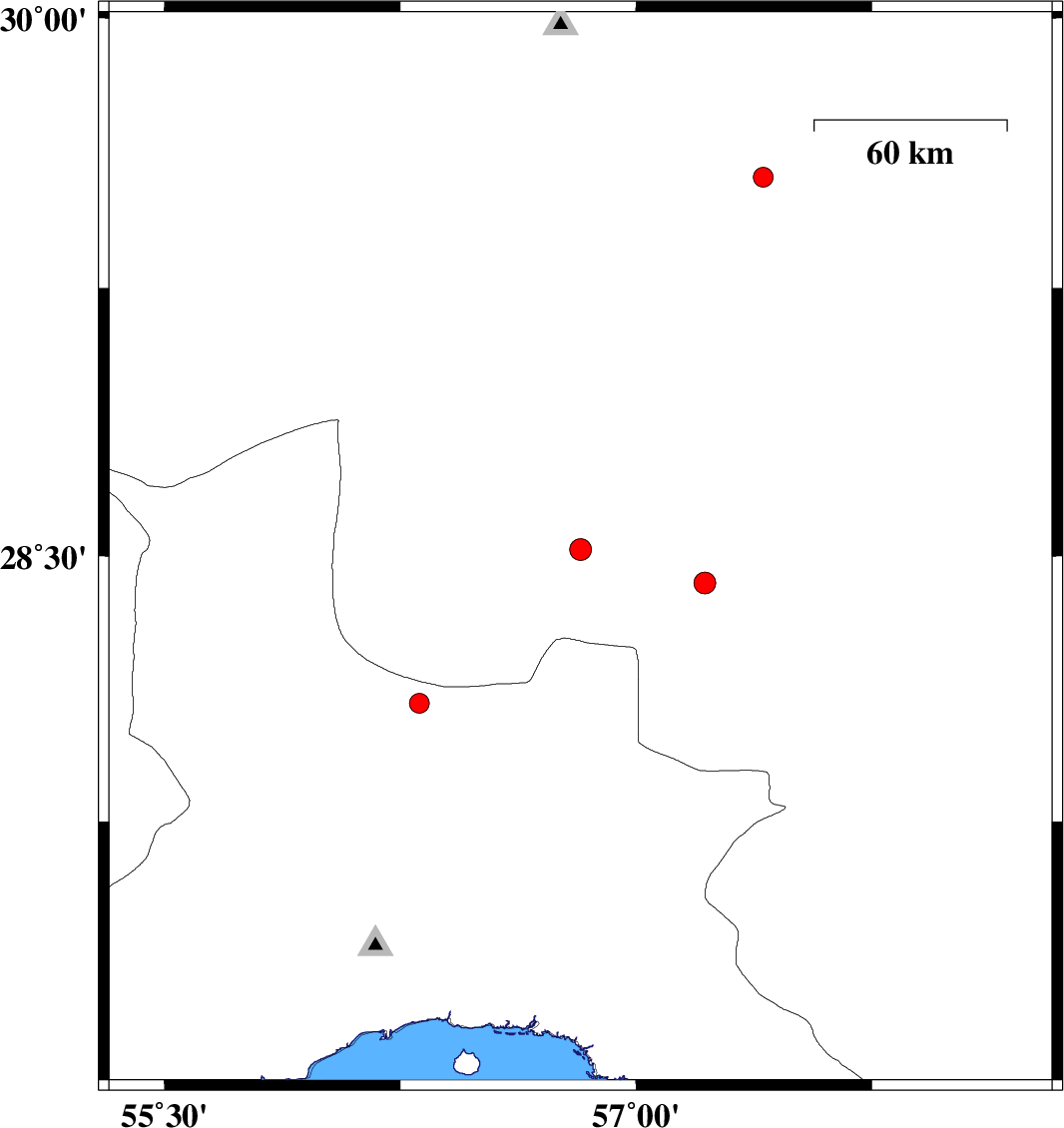 | 2015/07/18 | 05:42:57.5 | 10:12:57.5 | 28.423 | 57.219 | 14 | ML:3.1 | Kerman Province, 58 km South-West of Jiroft | ||