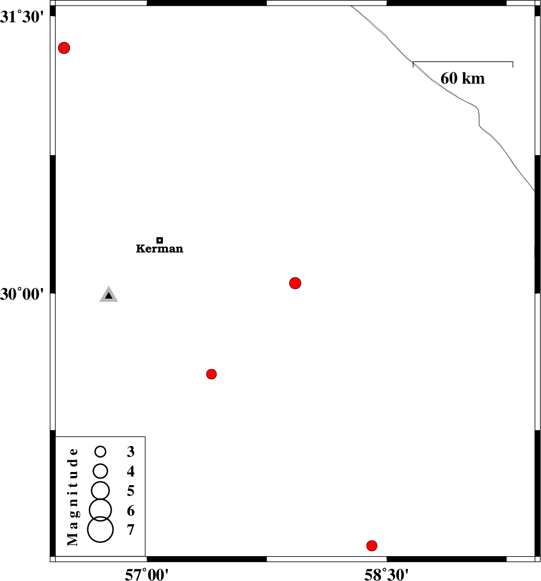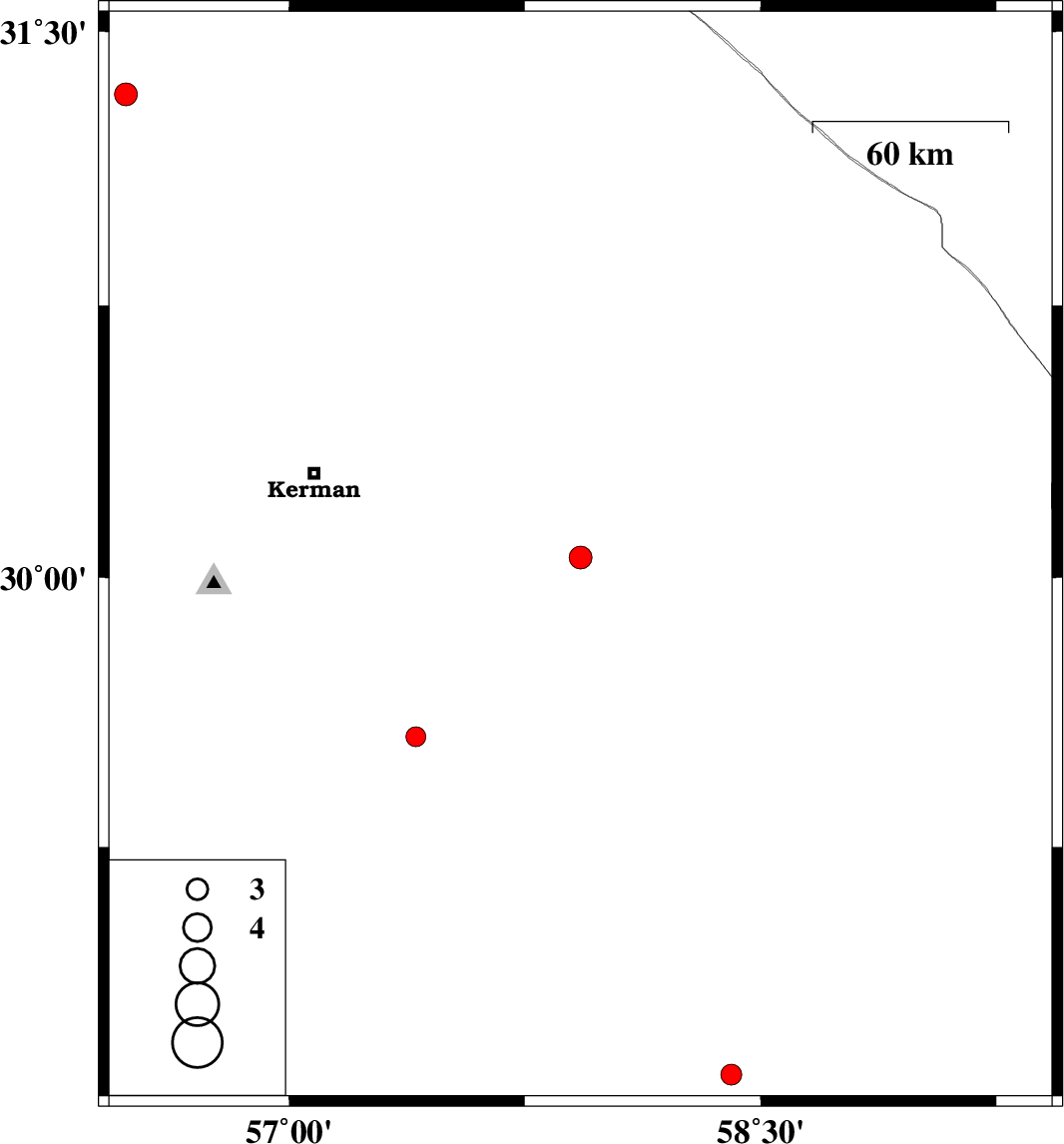 | 2015/07/17 | 19:55:01.3 | 00:25:01.3 | 29.558 | 57.404 | 18 | ML:2.8 | Kerman Province, 87 km South-East of Kerman |