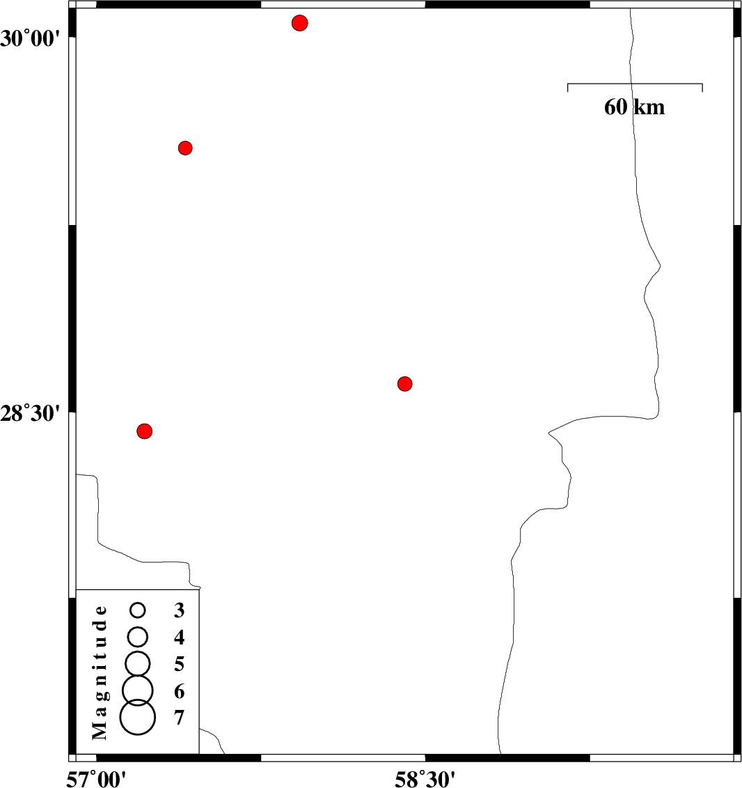 | 2015/07/20 | 14:54:15.1 | 19:24:15.1 | 28.614 | 58.406 | 18 | ML:2.9 | Kerman Province, 55 km South of Bam | ||