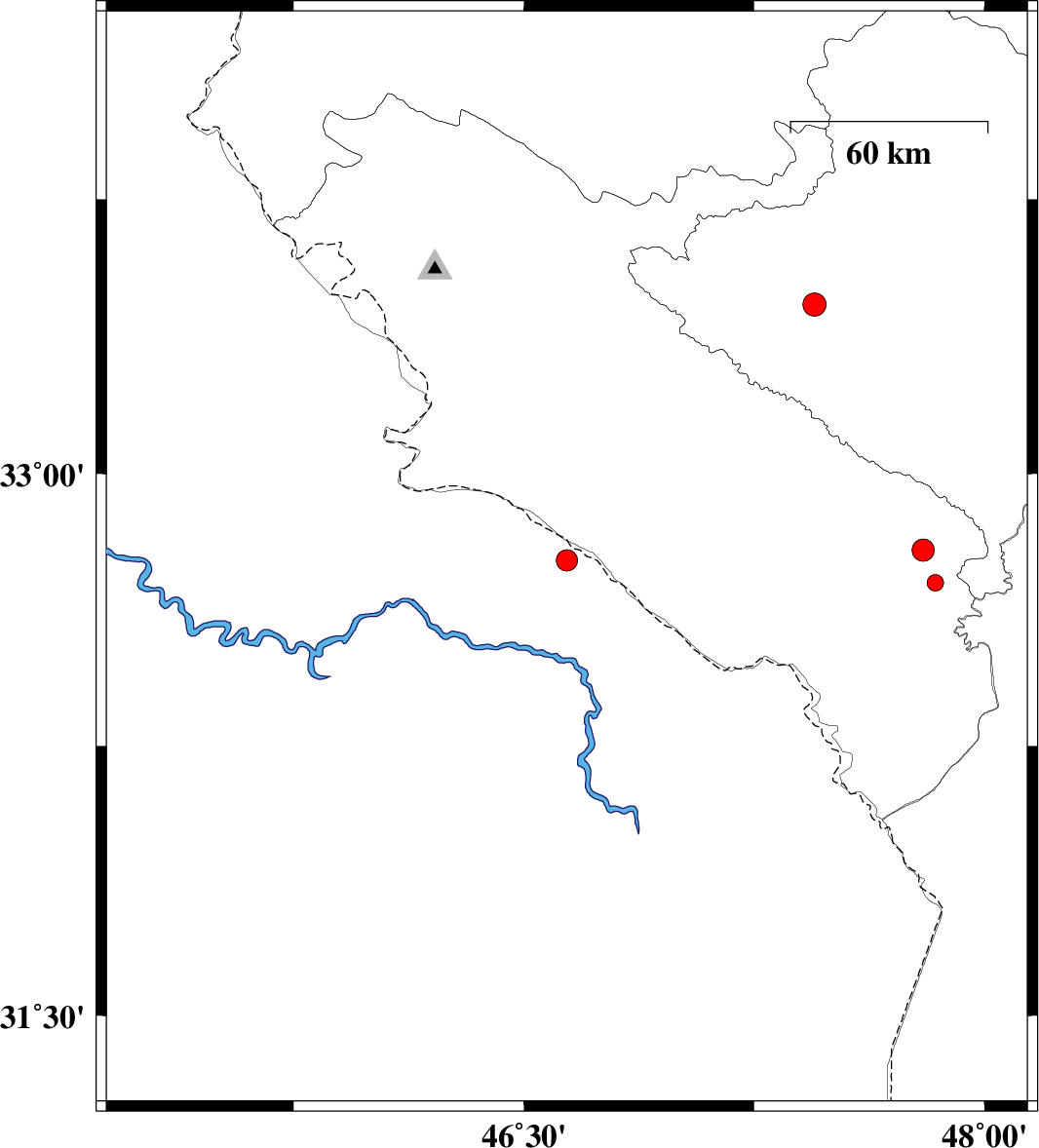 | 2015/07/21 | 07:40:10.7 | 12:10:10.7 | 32.762 | 46.64 | 15 | ML:3.1 | Iraq, 59 km -West of Dehloran | ||