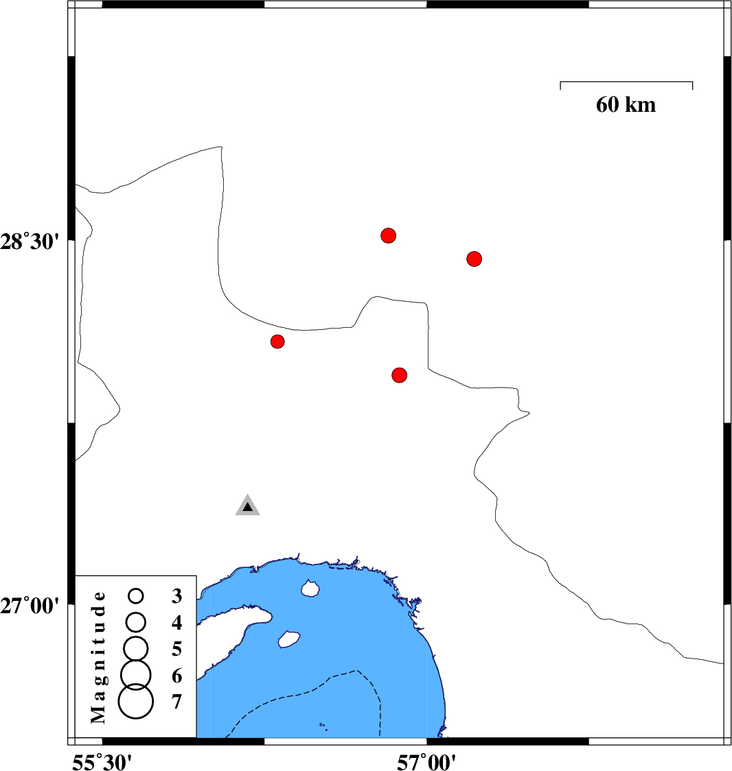 | 2015/07/19 | 00:55:03.4 | 05:25:03.4 | 28.518 | 56.823 | 15 | ML:3.1 | Kerman Province, 82 km South-East of Baft | ||