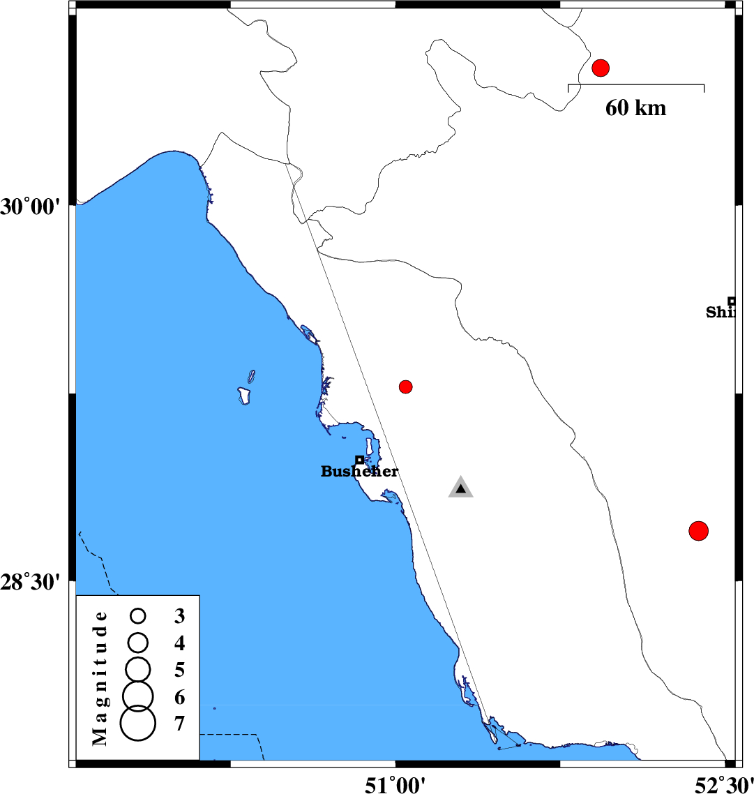 | 2015/06/26 | 05:16:04.2 | 09:46:04.2 | 28.7 | 52.38 | 6 | ML:3.9 | Fars Province, 25 km South-West of Firuz Abad |