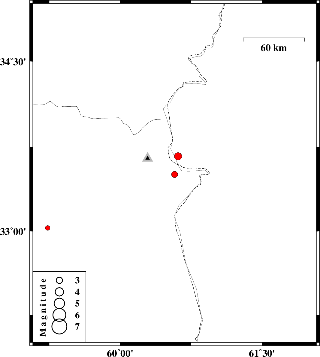 | 2015/07/28 | 14:05:50.3 | 18:35:50.3 | 33.505 | 60.576 | 20 | ML:2.9 | Khorasan(south) Province, 139 km South-West of Taybad | ||
