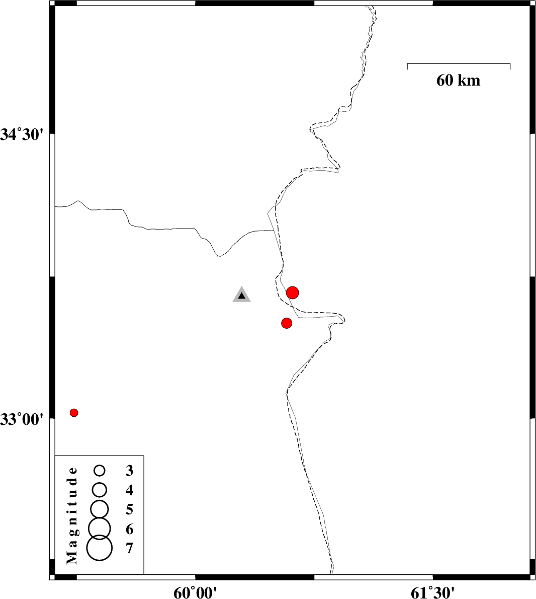 | 2015/07/28 | 14:05:50.3 | 18:35:50.3 | 33.505 | 60.576 | 20 | ML:2.9 | Khorasan(south) Province, 139 km South-West of Taybad | ||