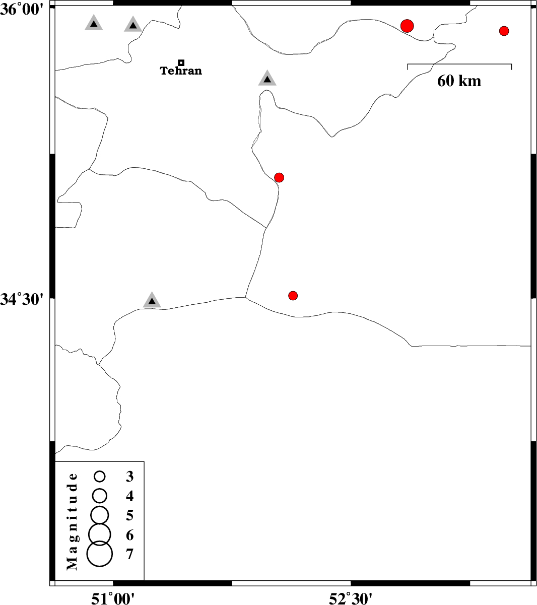 | 2015/07/30 | 06:19:25.2 | 10:49:25.2 | 35.127 | 52.047 | 14 | ML:2.7 | Semnan Province, 28 km -West of Garmsar | ||