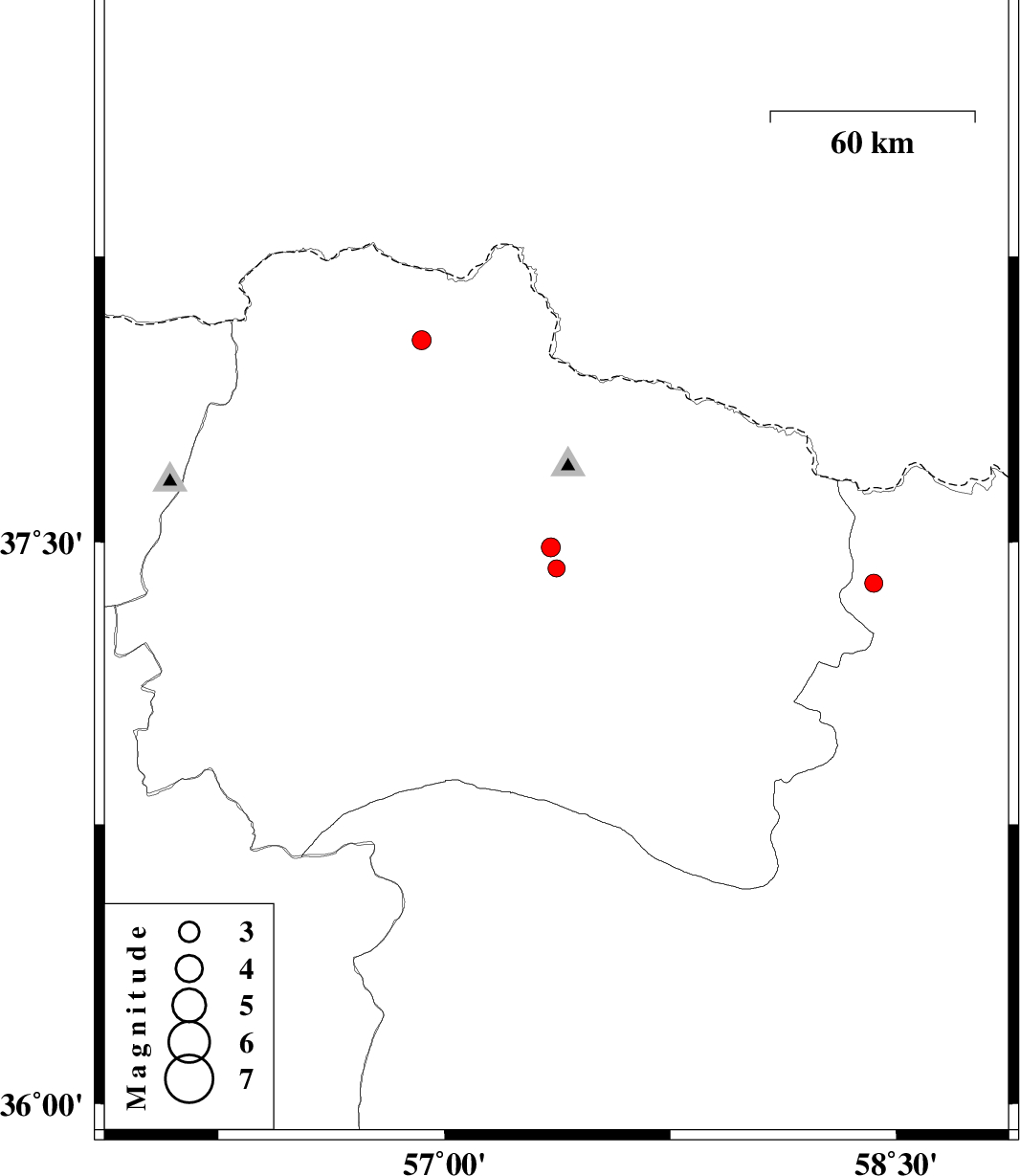 | 2015/07/20 | 09:22:53.1 | 13:52:53.1 | 37.39 | 58.425 | 14 | ML:2.7 | Khorasan(center) Province, 32 km North of Quchan |