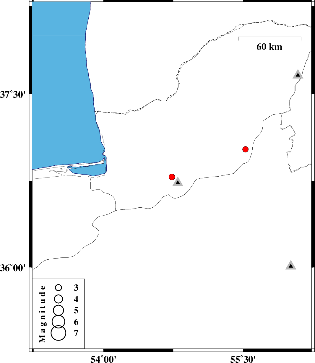| 2015/08/07 | 05:10:50.6 | 09:40:50.6 | 36.786 | 54.735 | 14 | ML:2.9 | Golestan Province, 18 km South-West of Ali Abad | ||