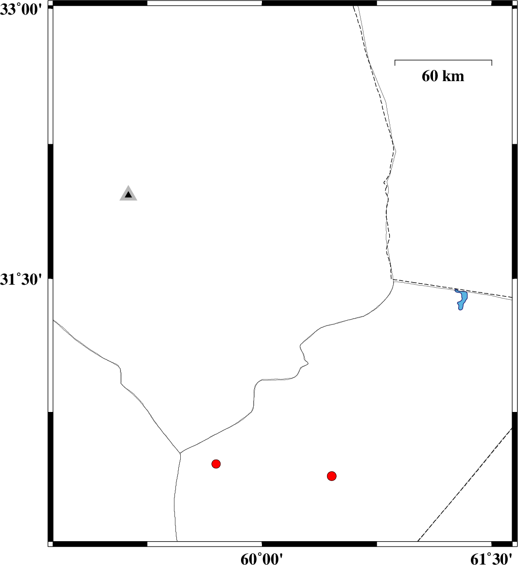 | 2015/08/10 | 17:23:11.2 | 21:53:11.2 | 31.516 | 60.134 | 14 | ML:2.7 | Khorasan(south) Province, 9 km of Nehbandan | ||
