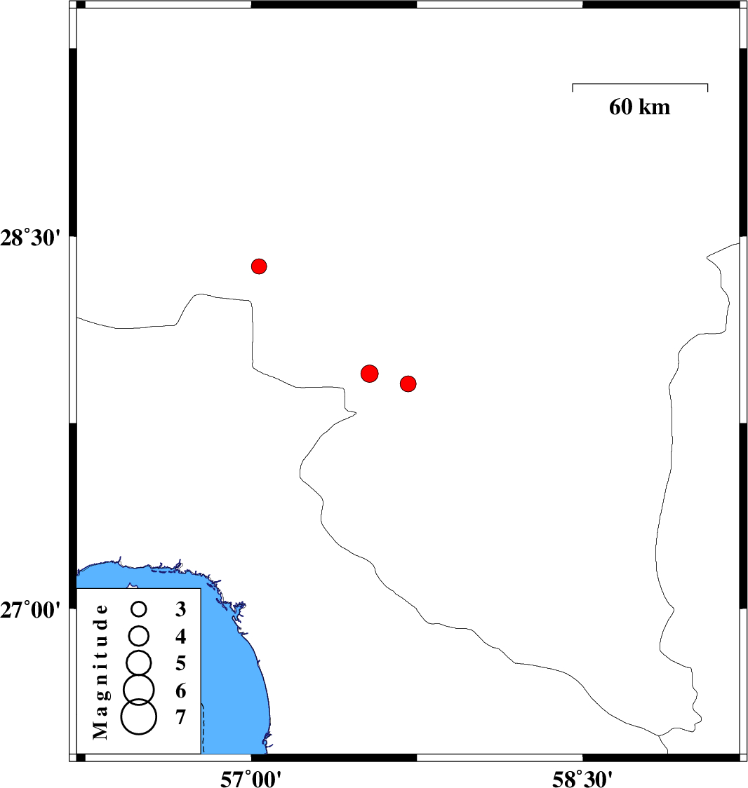 | 2015/08/13 | 00:26:04.6 | 04:56:04.6 | 27.909 | 57.71 | 14 | ML:3.2 | Kerman Province, 5 km of Kahnuj | ||