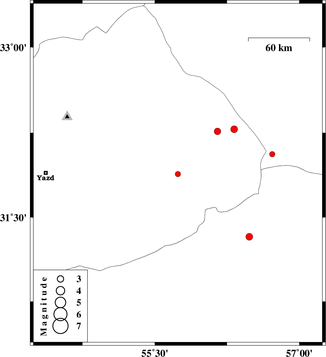 | 2015/08/13 | 08:09:06.5 | 12:39:06.5 | 31.884 | 55.74 | 14 | ML:2.5 | Yazd Province, 45 km North-East of Bafq | ||