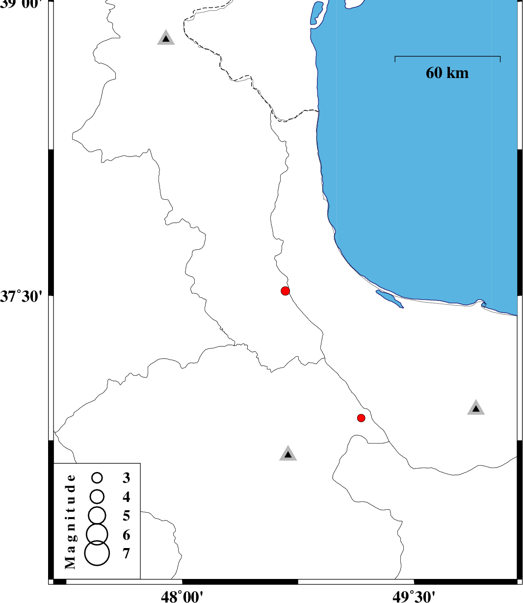 | 2015/08/15 | 23:09:34.6 | 03:39:34.6 | 37.523 | 48.667 | 27 | ML:2.5 | Ardebil Province, 17 km South-East of Khalkhal | ||