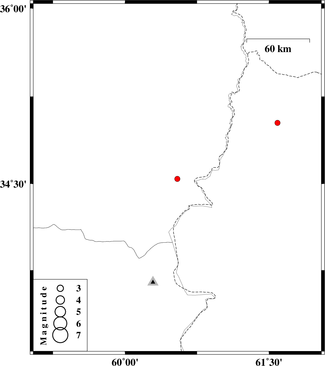 | 2015/08/16 | 09:22:44.2 | 13:52:44.2 | 34.542 | 60.545 | 18 | ML:2.6 | Khorasan(center) Province, 37 km -East of Khaf | ||