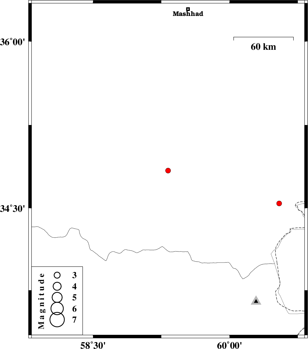 | 2015/08/16 | 09:22:44.2 | 13:52:44.2 | 34.542 | 60.545 | 18 | ML:2.6 | Khorasan(center) Province, 37 km -East of Khaf |