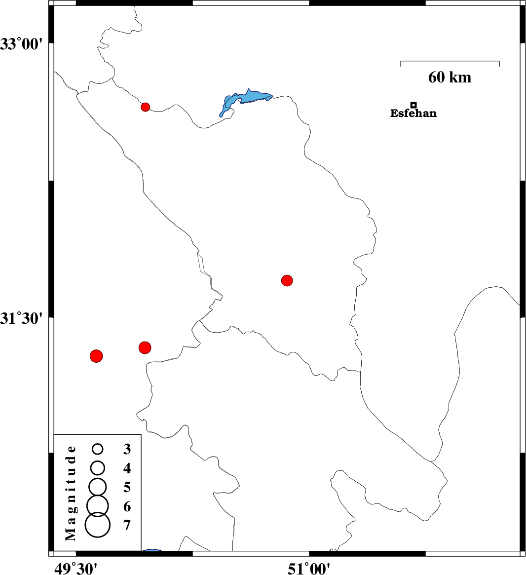 | 2015/08/18 | 09:46:17.9 | 14:16:17.9 | 31.703 | 50.857 | 18 | ML:3.3 | Chaharmahal Bakhtiari Province, 23 km North of Lordegan | ||