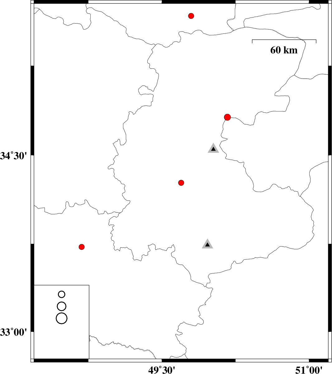 | 2015/08/21 | 04:16:15.5 | 08:46:15.5 | 34.267 | 49.696 | 14 | ML:2.5 | Markazi Province, 20 km North of Arak | ||