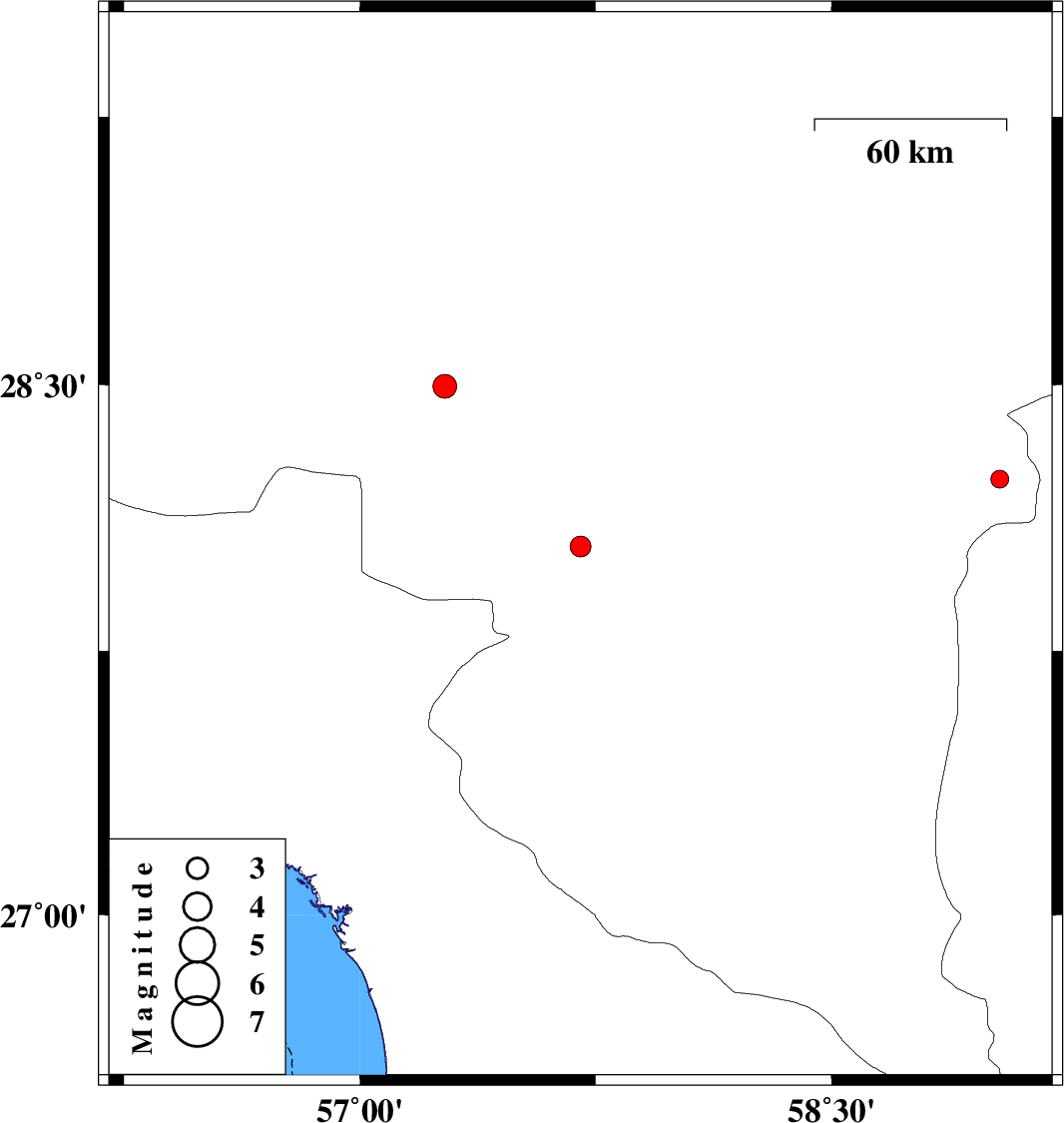 | 2015/08/30 | 00:23:57.3 | 04:53:57.3 | 28.044 | 57.702 | 14 | ML:2.9 | Kerman Province, 10 km of Kahnuj | ||