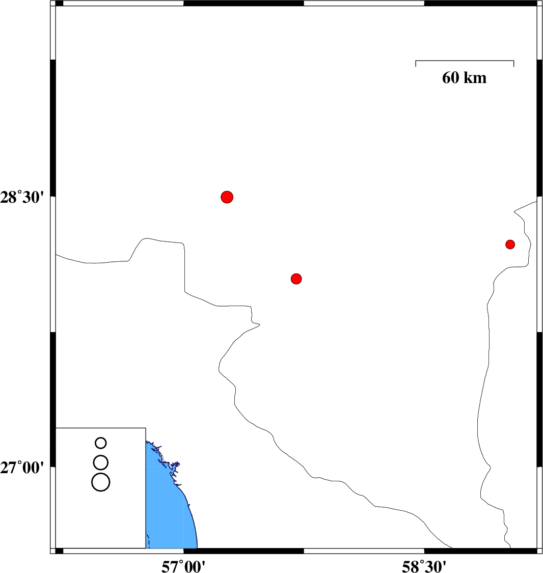 | 2015/08/27 | 07:24:58.8 | 11:54:58.8 | 28.234 | 59.036 | 14 | ML:2.6 | Kerman Province, 118 km South-East of Bam | ||