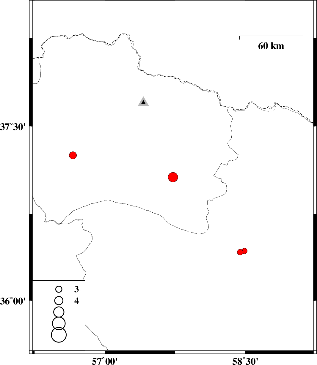 | 2015/08/27 | 20:45:17.1 | 01:15:17.1 | 37.251 | 56.659 | 15 | ML:3.5 | Khorasan(north) Province, 41 km North-East of Jajarm | ||