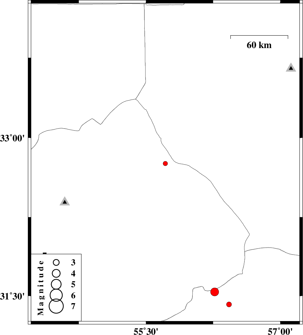 | 2015/09/01 | 14:29:29.5 | 18:59:29.5 | 32.757 | 55.716 | 15 | ML:2.3 | Yazd Province, 132 km North-East of Bafq | ||