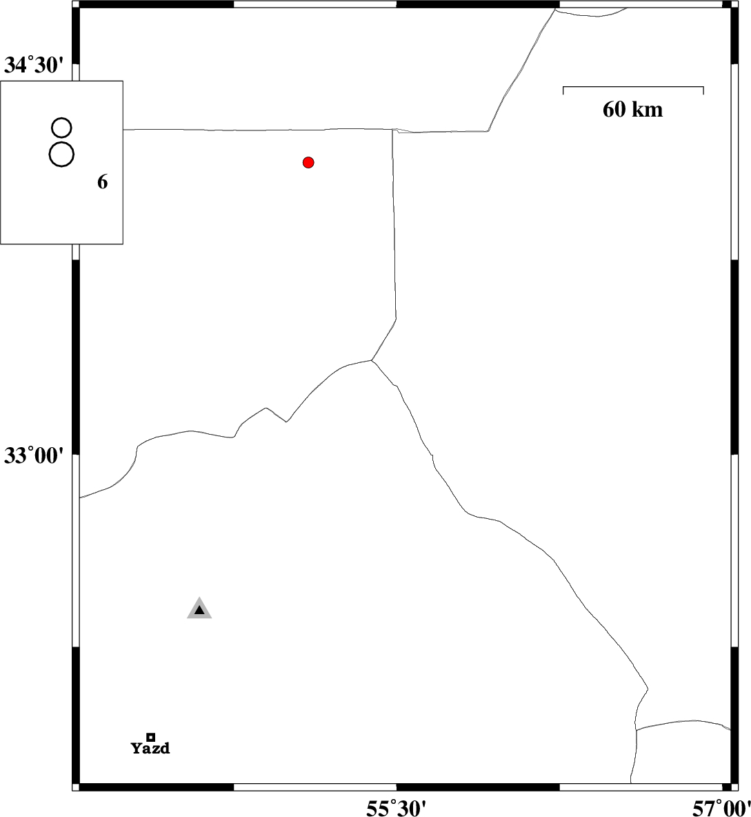 2015/09/05 | 00:20:29.9 | 04:50:29.9 | 33.214 | 55.539 | 15 | ML:2.6 | Yazd Province, 180 km North-East of Bafq | ||