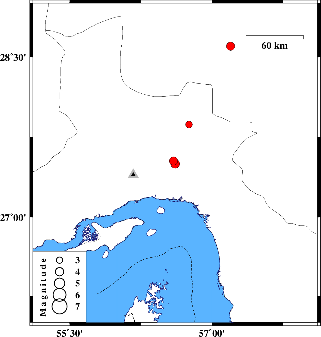 | 2015/09/04 | 04:28:26.6 | 08:58:26.6 | 27.87 | 56.76 | 14 | ML:3.2 | Hormozgan Province, 68 km North-West of Dehbarez |