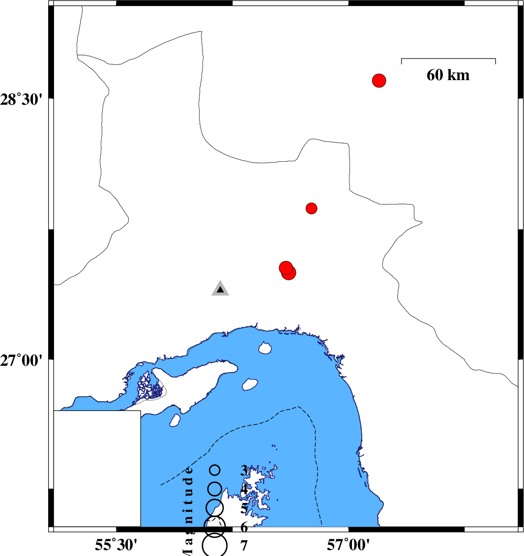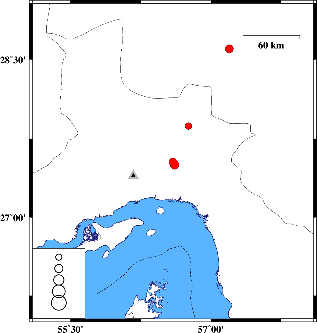 | 2015/09/04 | 04:28:26.6 | 08:58:26.6 | 27.87 | 56.76 | 14 | ML:3.2 | Hormozgan Province, 68 km North-West of Dehbarez |