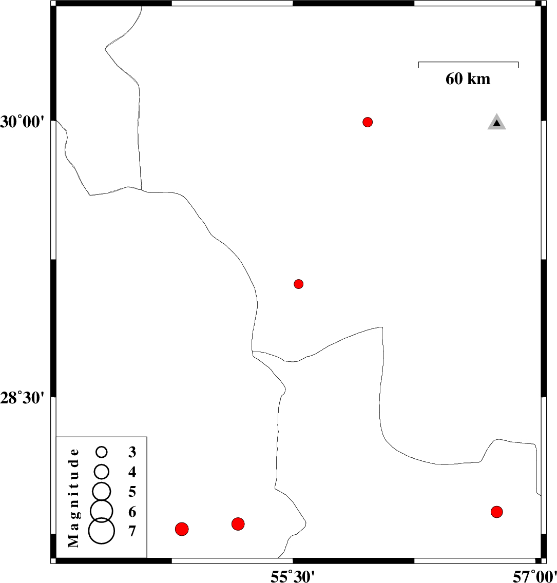 | 2015/09/04 | 04:28:26.6 | 08:58:26.6 | 27.87 | 56.76 | 14 | ML:3.2 | Hormozgan Province, 68 km North-West of Dehbarez | ||