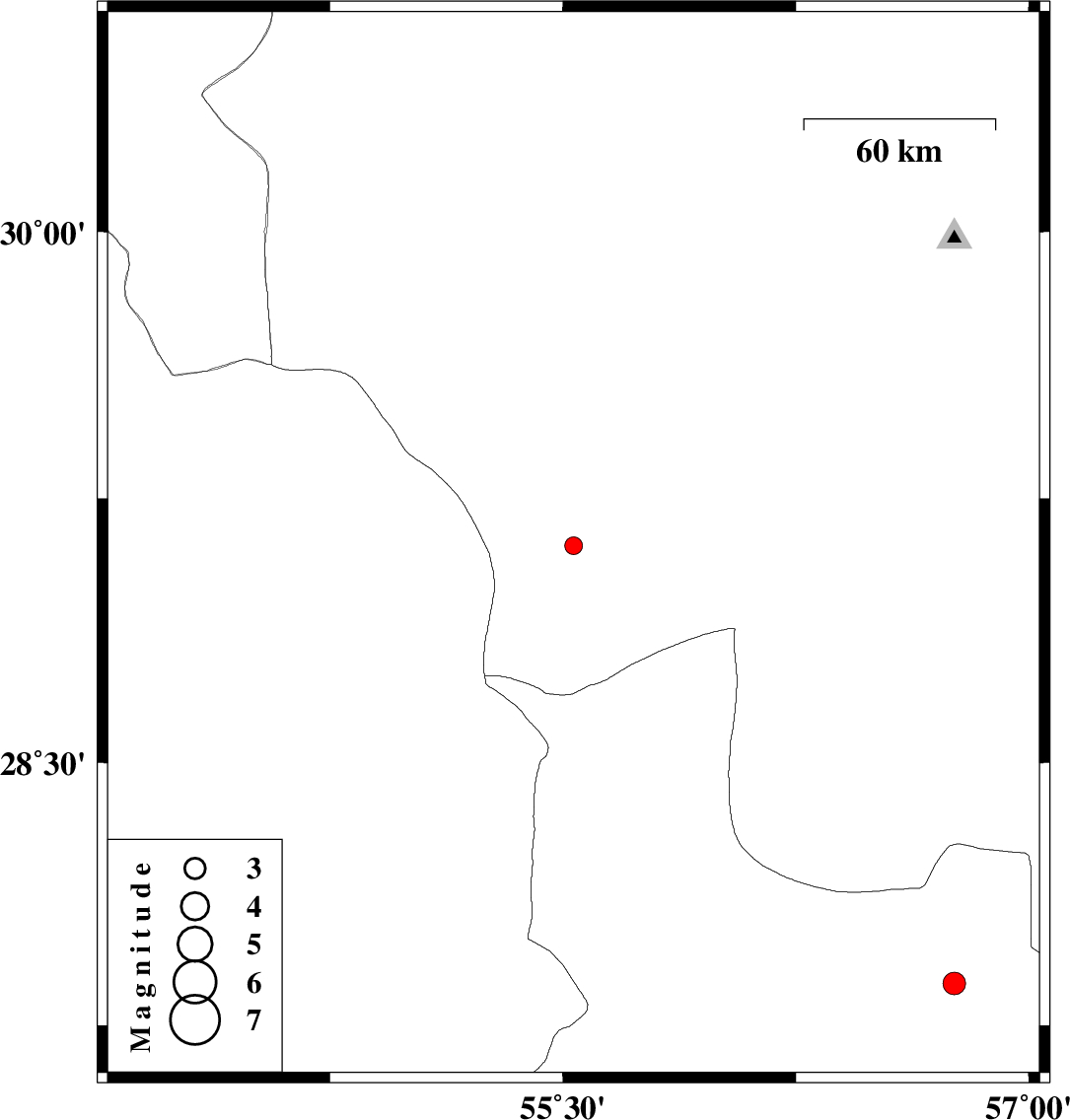 | 2015/09/04 | 04:28:26.6 | 08:58:26.6 | 27.87 | 56.76 | 14 | ML:3.2 | Hormozgan Province, 68 km North-West of Dehbarez |