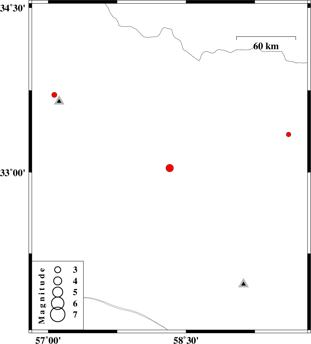 | 2015/09/13 | 01:05:43.2 | 05:35:43.2 | 33.039 | 58.322 | 14 | ML:3.7 | Khorasan(center) Province, 86 km North-West of Birjand | ||