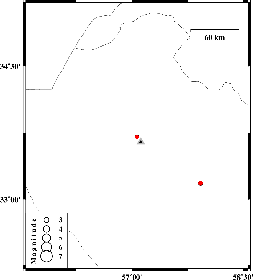 | 2015/09/10 | 23:18:38.8 | 03:48:38.8 | 33.709 | 57.066 | 14 | ML:2.5 | Yazd Province, 18 km North-East of Tabas | ||