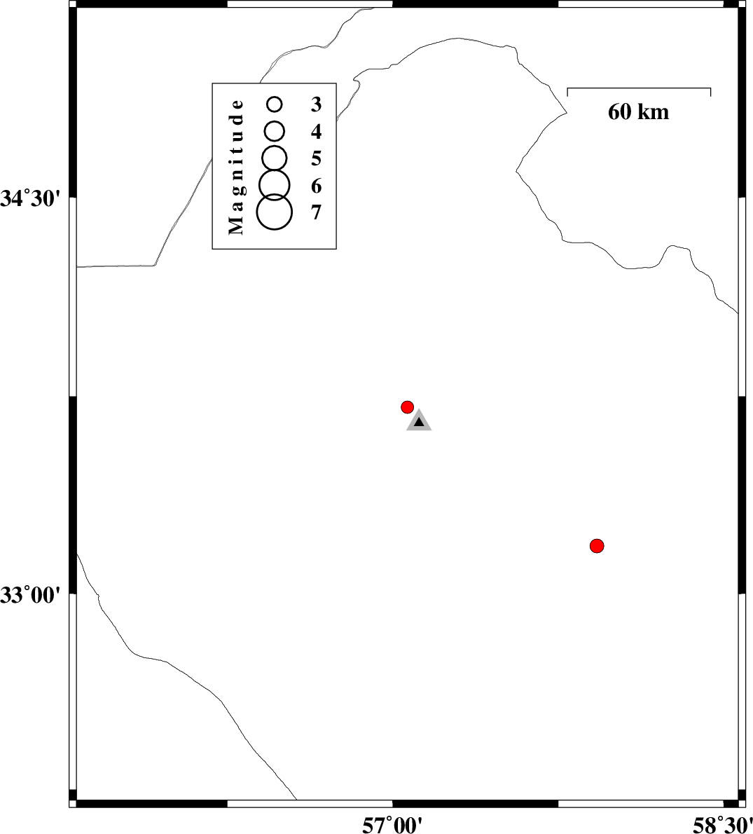 2015/09/05 | 23:27:47.8 | 03:57:47.8 | 33.182 | 57.925 | 14 | ML:2.8 | Khorasan(center) Province, 95 km South-West of Ferdows |