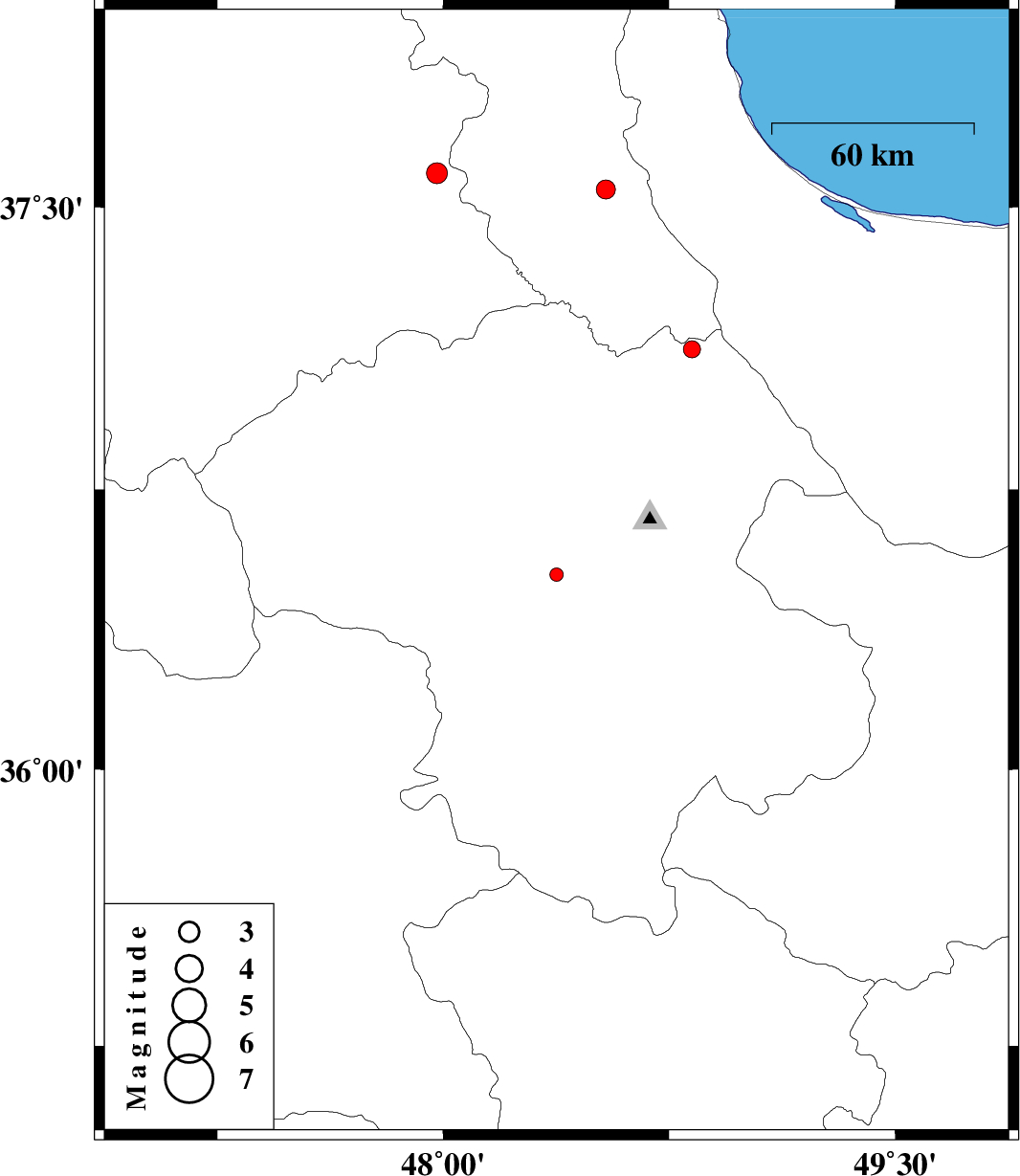 | 2015/09/06 | 04:26:47.6 | 08:56:47.6 | 37.59 | 47.979 | 14 | ML:3.1 | Azarbaijan Sharghi Province, 29 km North-East of Mianeh |