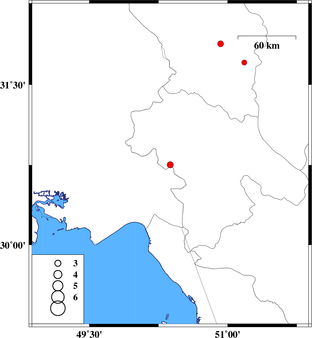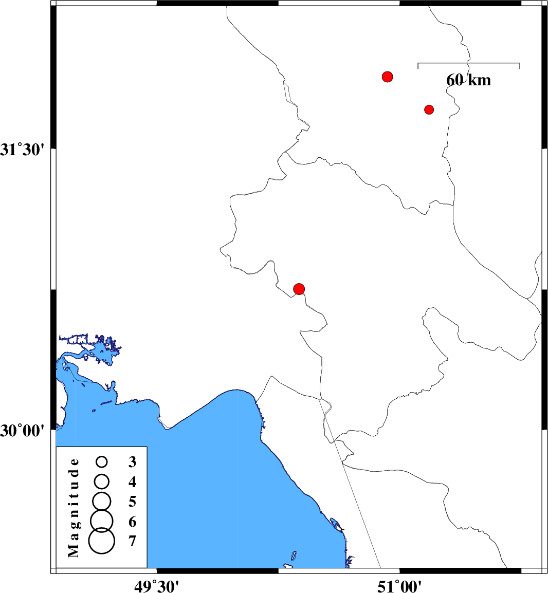| 2015/09/19 | 02:04:00.3 | 06:34:00.3 | 30.752 | 50.377 | 14 | ML:3.1 | Kohkiluieh va boyerahmad Province, 18 km -West of Dehdasht | ||