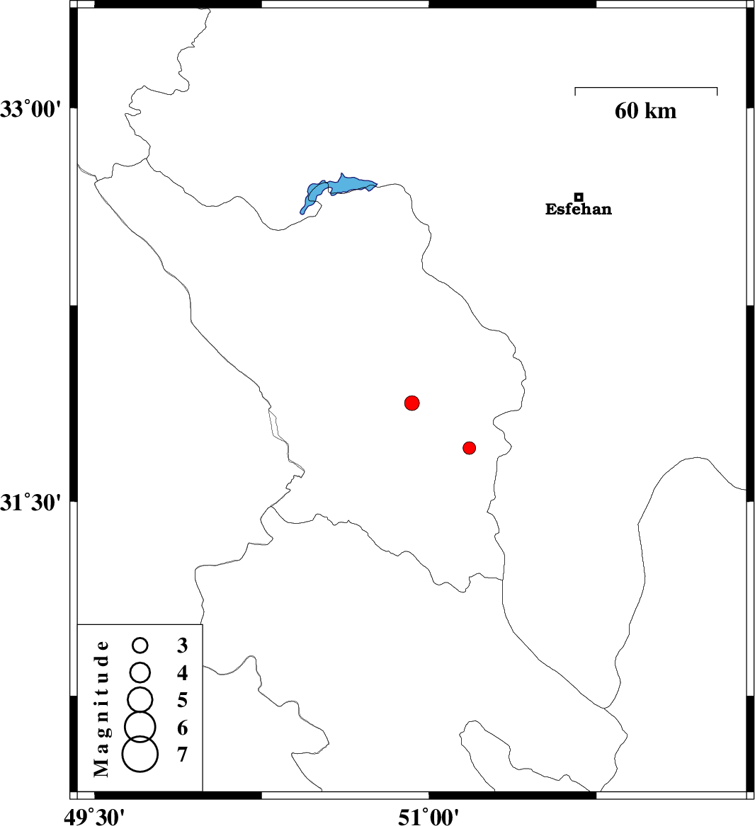 | 2015/09/17 | 01:27:13.7 | 05:57:13.7 | 31.705 | 51.18 | 15 | ML:2.5 | Chaharmahal Bakhtiari Province, 31 km South-West of Borujen | ||