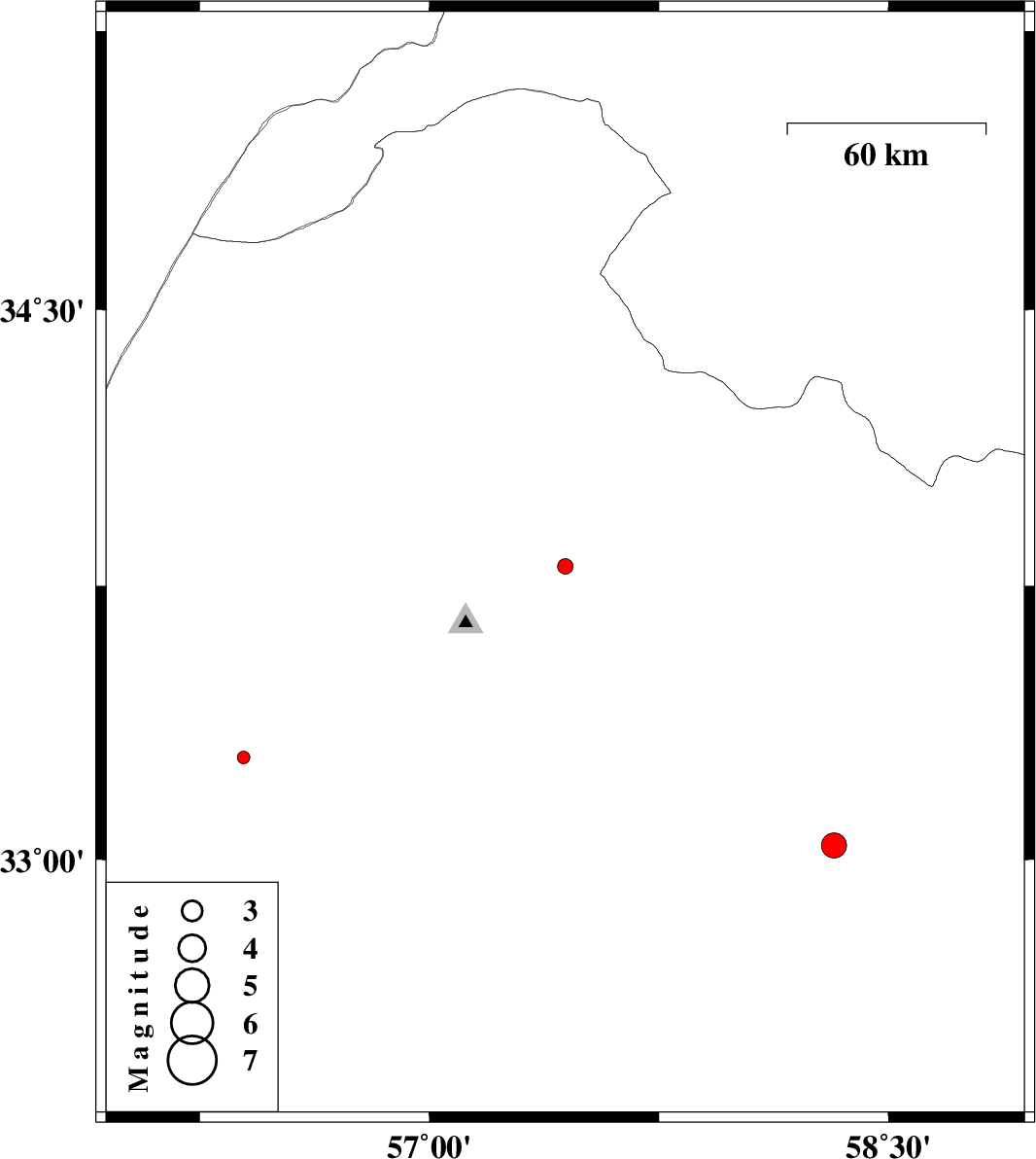 | 2015/09/11 | 08:02:39.7 | 12:32:39.7 | 33.281 | 56.393 | 14 | ML:1.8 | Yazd Province, 61 km South-West of Tabas |
