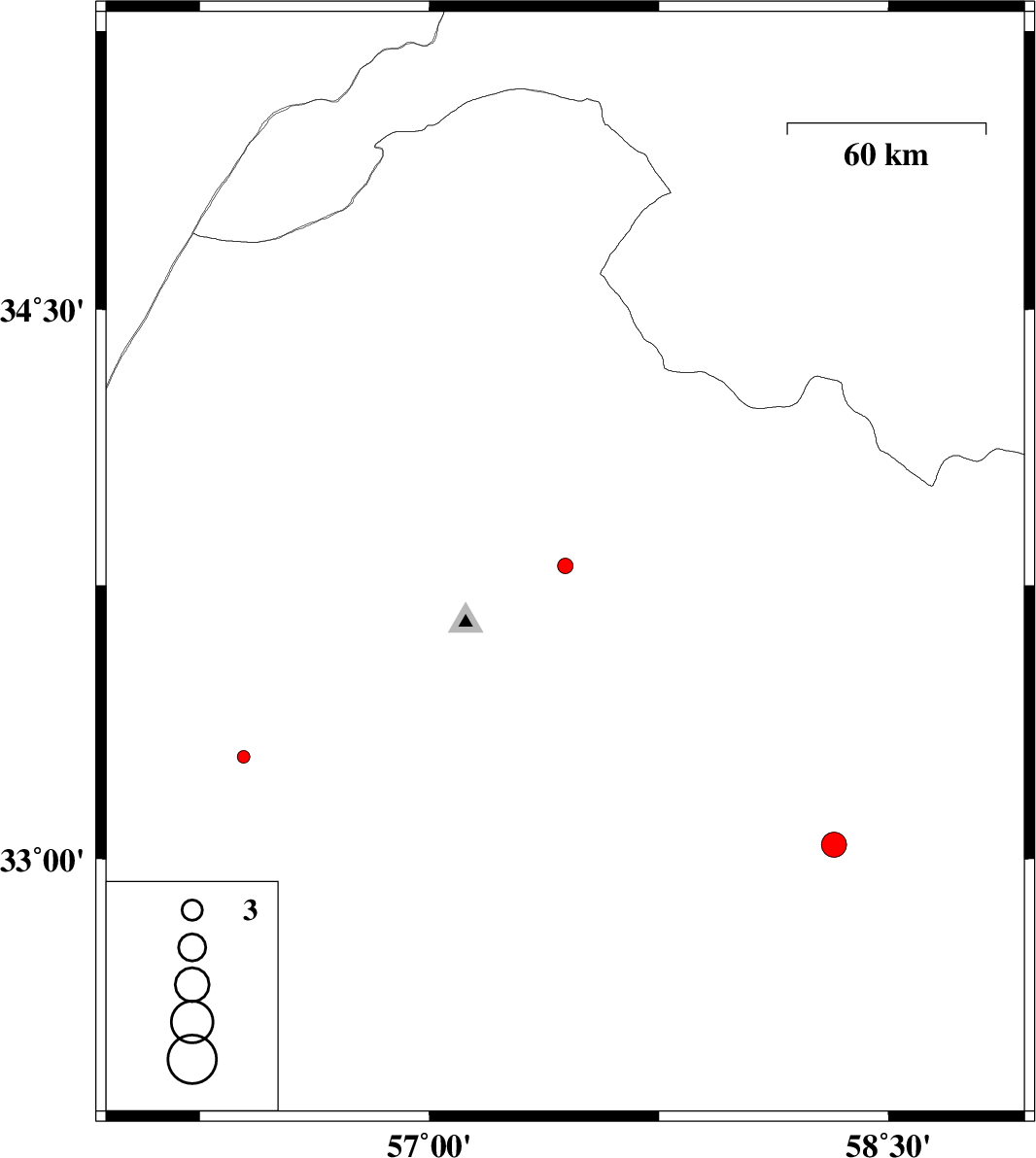 | 2015/09/18 | 19:27:04.5 | 23:57:04.5 | 33.803 | 57.444 | 15 | ML:2.3 | Khorasan(center) Province, 53 km North-East of Tabas | ||