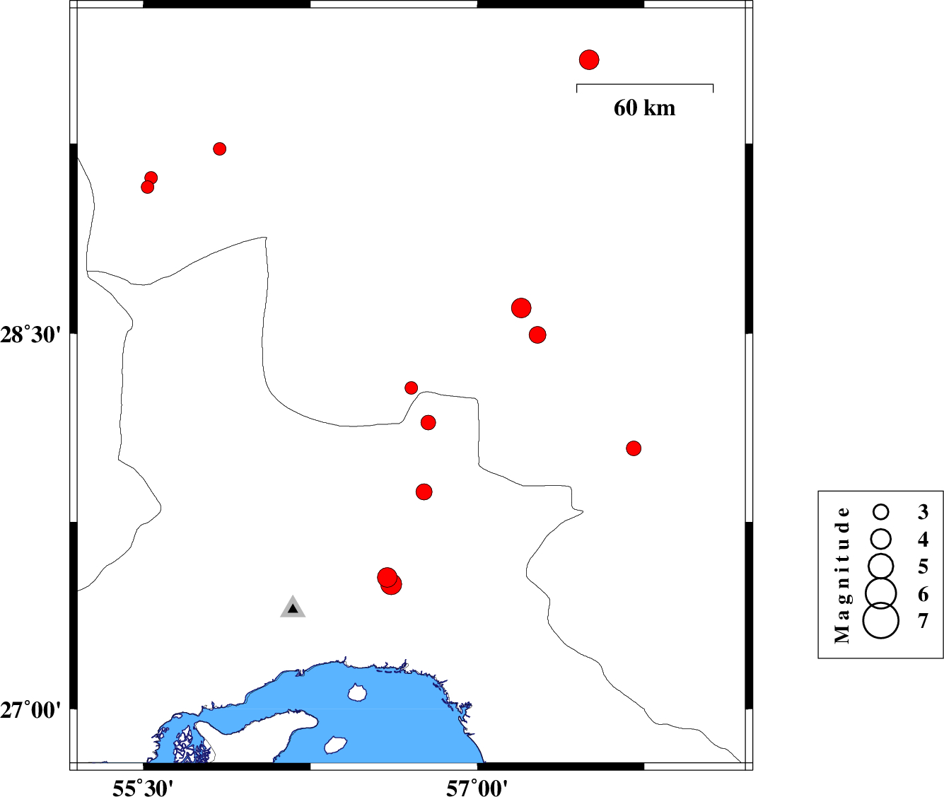 2015/09/04 04:28:26.6 08:58:26.6 27.8756.7614 ML:3.2 Hormozgan Province, 68 km North-West of Dehbarez