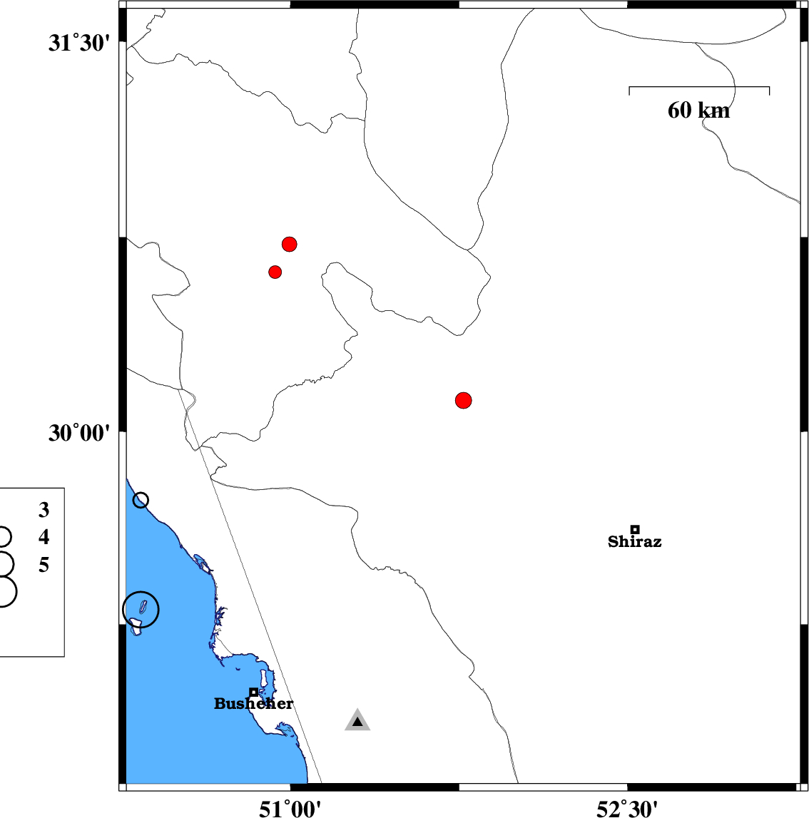 | 2015/09/16 | 02:39:19.2 | 07:09:19.2 | 29.628 | 52.607 | 18 | ML:3.3 | Fars Province, 7 km of Shiraz |