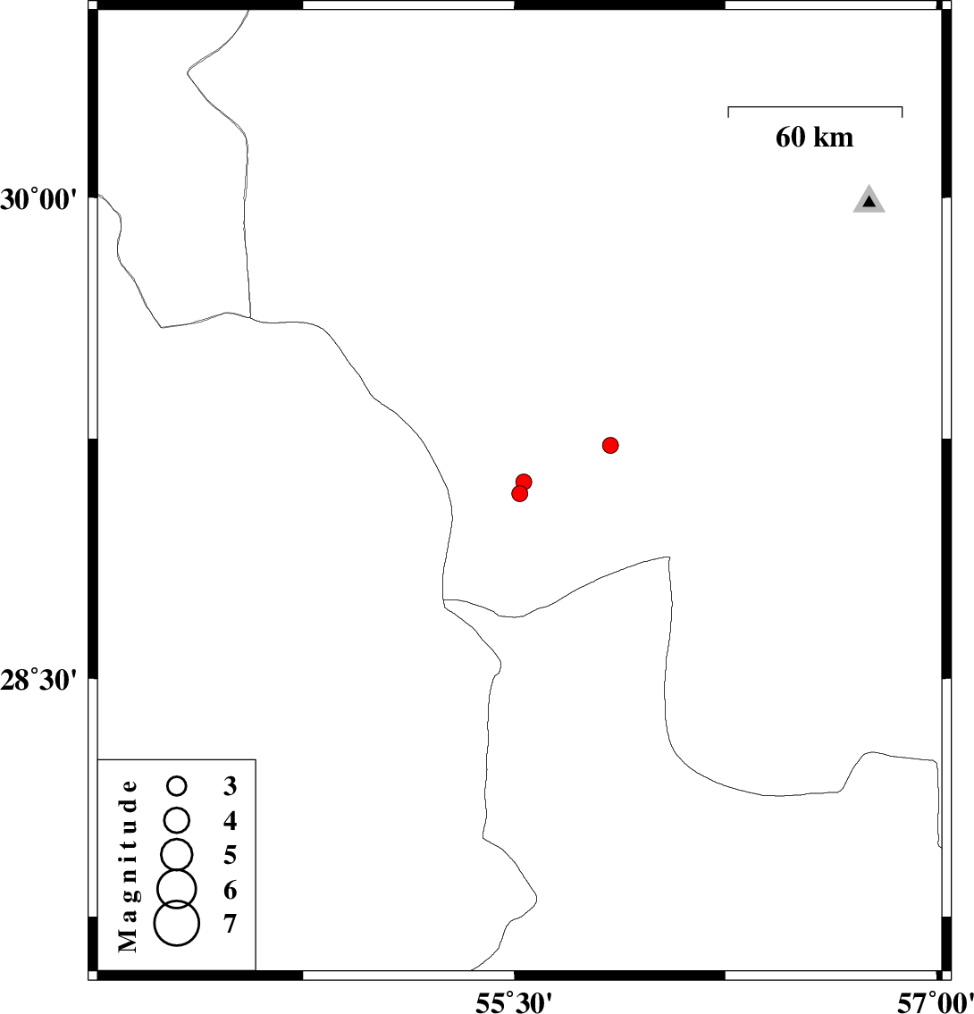 | 2015/09/09 | 09:38:09.8 | 14:08:09.8 | 29.116 | 55.534 | 14 | ML:2.5 | Kerman Province, 39 km South-West of Sirjan |