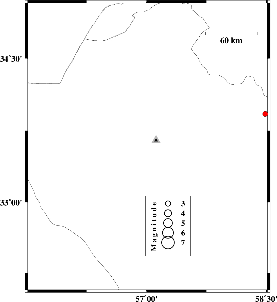 2015/09/18 | 19:27:04.5 | 23:57:04.5 | 33.803 | 57.444 | 15 | ML:2.3 | Khorasan(center) Province, 53 km North-East of Tabas | ||