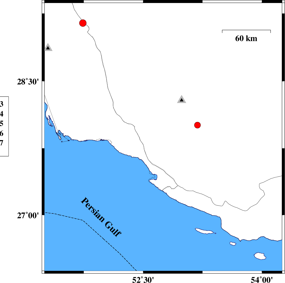 | 2015/09/25 | 08:36:55.9 | 12:06:55.9 | 27.868 | 52.754 | 18 | ML:3.9 | Fars Province, 38 km North-West of Mehr | ||