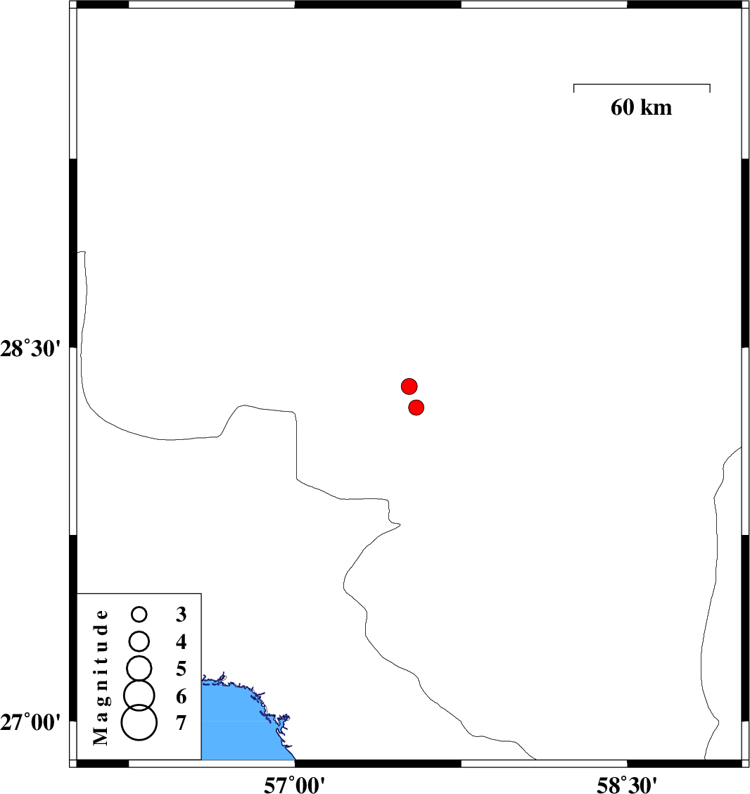 | 2015/09/27 | 08:29:29.9 | 11:59:29.9 | 28.26 | 57.547 | 15 | ML:3.1 | Kerman Province, 37 km North-West of Kahnuj | ||