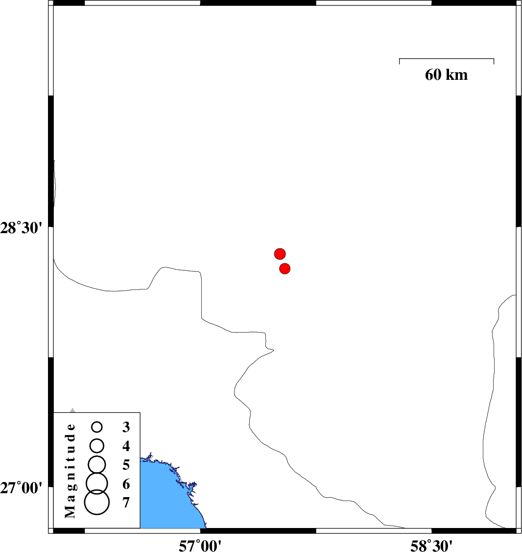 | 2015/09/27 | 08:29:29.9 | 11:59:29.9 | 28.26 | 57.547 | 15 | ML:3.1 | Kerman Province, 37 km North-West of Kahnuj | ||