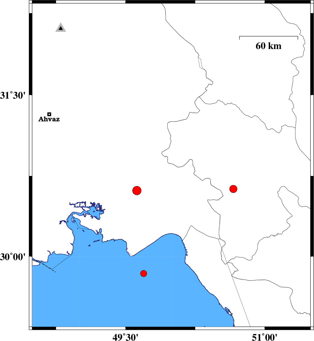 | 2015/09/27 | 14:52:01.6 | 18:22:01.6 | 30.84 | 49.993 | 15 | ML:3.1 | Khoozestan Province, 29 km -East of Omidiyeh | ||