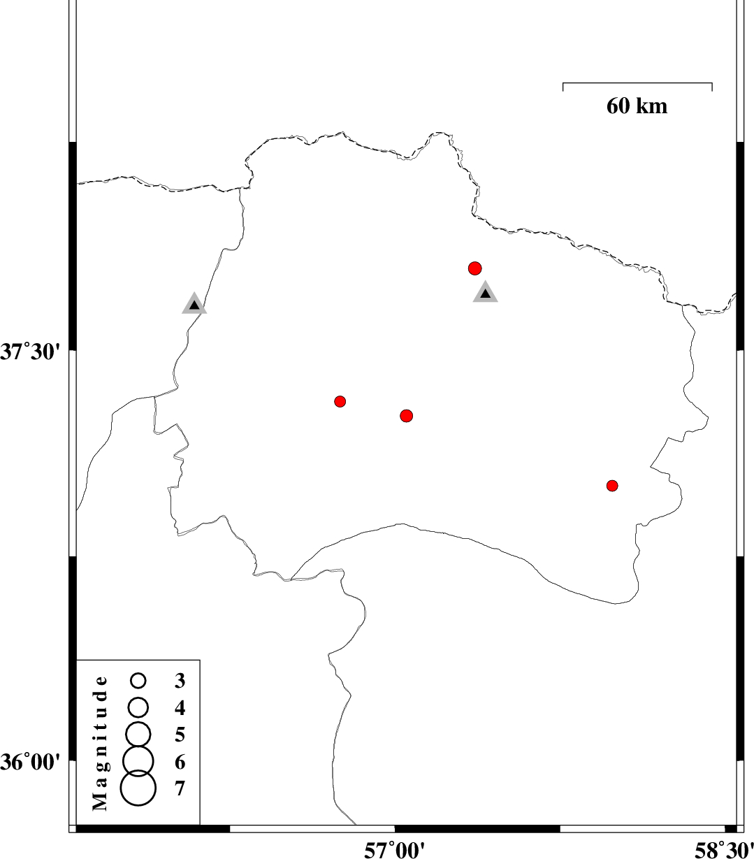 | 2015/09/29 | 02:20:47.4 | 05:50:47.4 | 37.261 | 57.052 | 14 | ML:2.5 | Khorasan(north) Province, 34 km South-East of Ashkhaneh | ||
