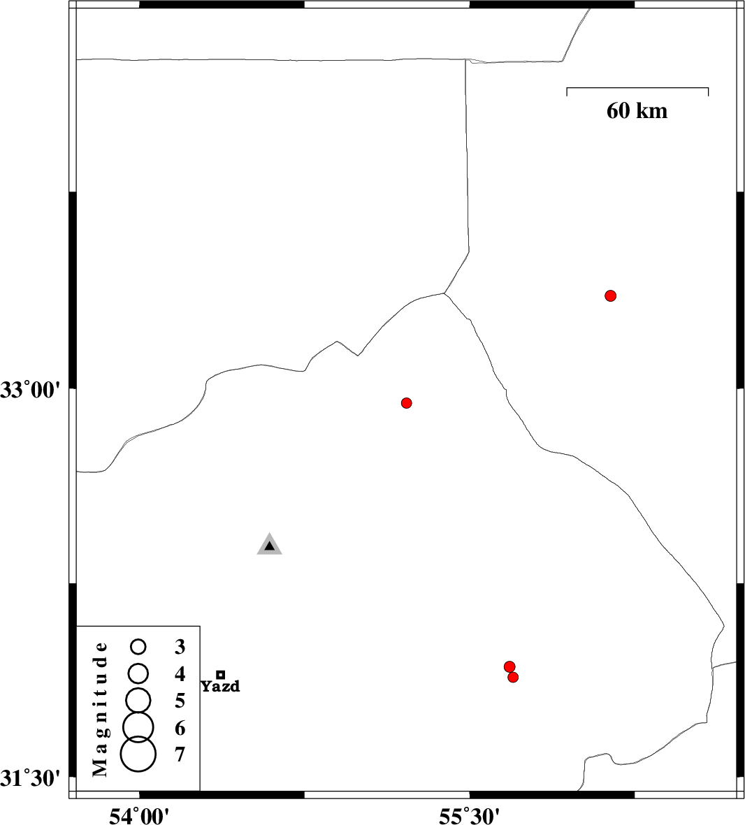 | 2015/09/27 | 09:05:15.3 | 12:35:15.3 | 31.927 | 55.682 | 9 | ML:2.2 | Yazd Province, 45 km North-East of Bafq |